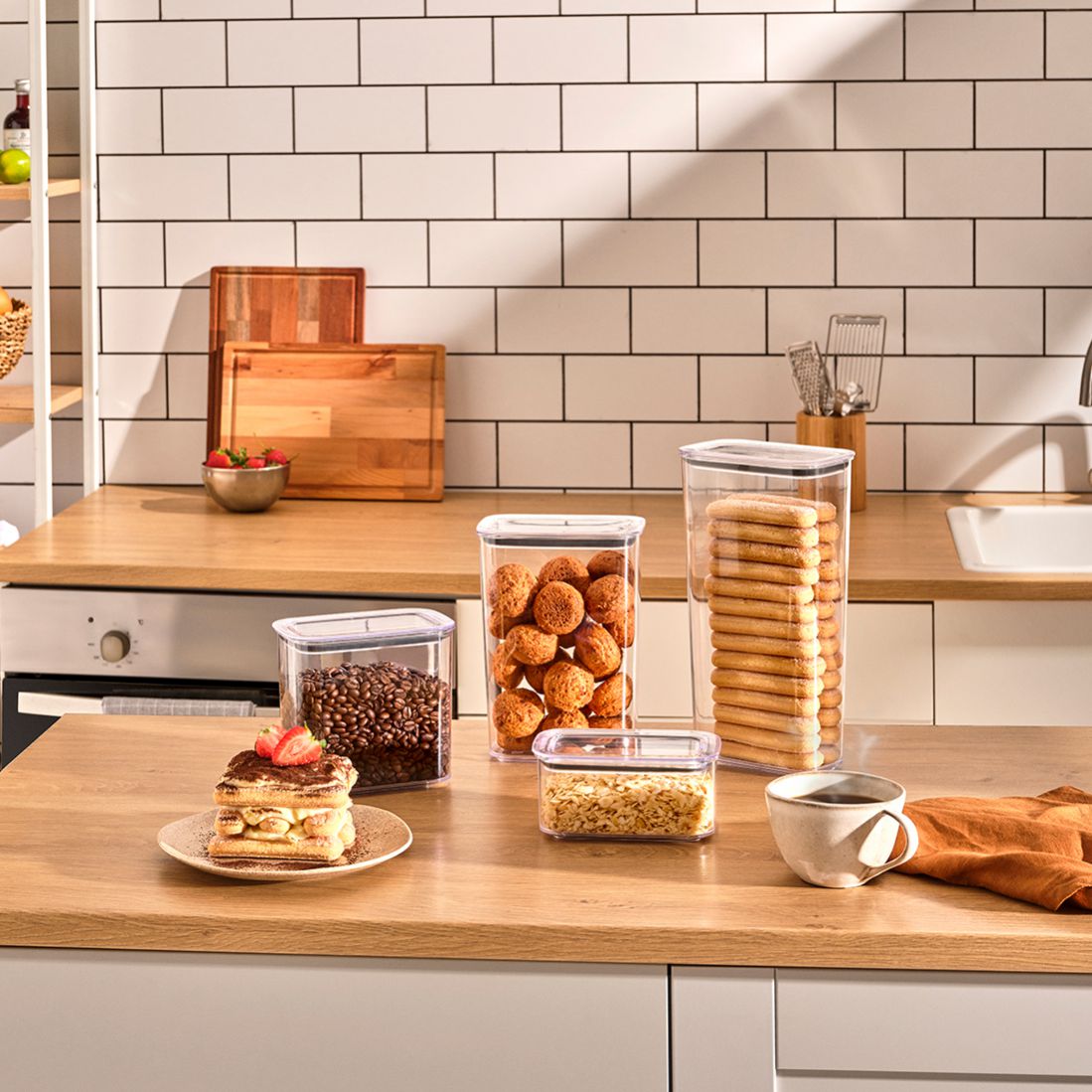 - Modüler istifleme dizaynı sayesinde dolaplarda, kilerde ve buzdolabında akıllı depolama alanları oluşturur.